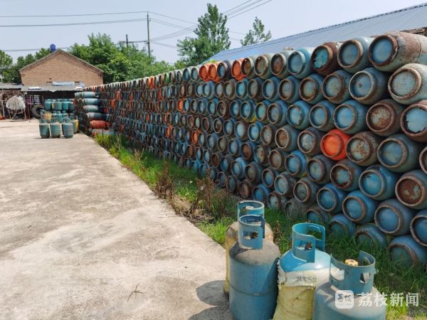 在宿迁市洋河新区紫金名门小区南侧,有个比较荒芜的院子,院门经常紧锁。打开紧闭的铁门,记者立即被眼前的景象惊呆了,几百瓶报废的液化气钢瓶堆在院子的西边,而院子的东边则是几个巨大的槽罐。它们都锈迹斑斑,在烈日下暴晒,一旦任何一瓶有事故,后果不堪设想。燃气安全专家、南京平燃安全咨询服务有限公司高级工程师胡孔成告诉记者,“不管是报废瓶还是在用气瓶,露天存放是不可以的。实际上瓶子里面还是存有一部分的燃气的,随着高温烈日的暴晒,里面的密封圈受热以后,会出现问题。”