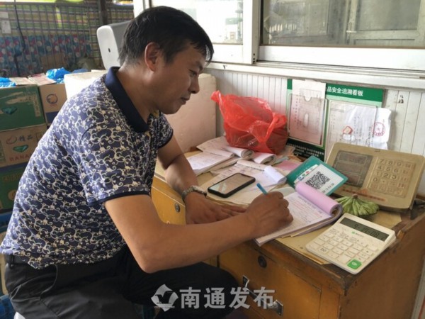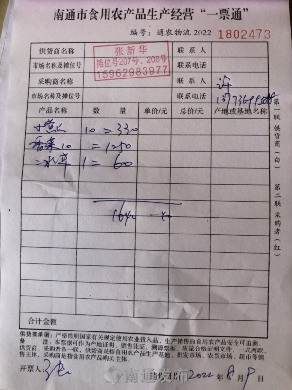 小黄瓜10斤、香菜10斤、冰草1斤……8月9日上午,南通农副产品物流中心蔬菜区8号大棚的经营户张新华把采购商购买的蔬菜品种、数量、价格等信息逐一记录在《南通市食用农产品生产经营“一票通”》上。