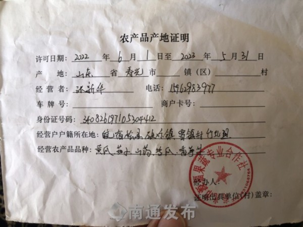 张新华主营山东寿光蔬菜。进货渠道正规吗?他拿出两份单据,一份是盖有寿光市某果蔬专业合作社公章的农产品产地证明,另一份则是产地采购清单,上面详细写有品名、数量、单价等信息。这两份单据,是他的菜进入通农物流必不可少的“通行证”。而“一票通”则相当于他的菜卖出去时附给采购商的一张购物小票。“你看,这上面有我的名字、摊位号和电话,菜有问题直接能找到我。”