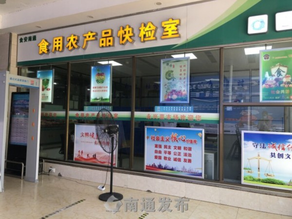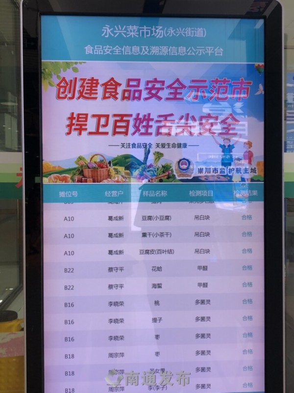 8月8日上午9点来到崇川区永兴菜市场,一进门就看到装有透明玻璃墙的食用农产品快检室,旁边是一块电子屏,上面的食品安全信息及溯源信息公示平台循环滚动着该市场农产品当天的快检结果,摊位号、经营户、样品名称、检测项目、检测结果一目了然。“看到结果都是合格的,买菜也更放心。”家住永兴花苑的周阿姨说。