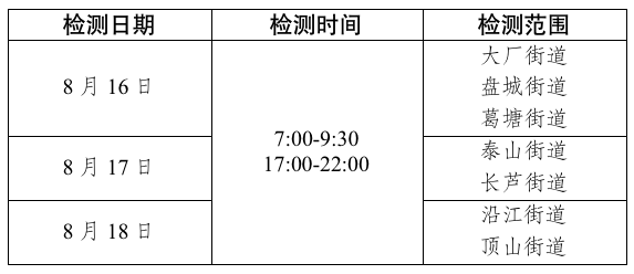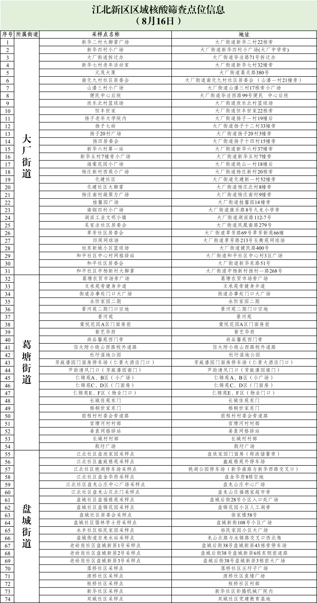 根据当前疫情防控工作需要,江北新区新冠肺炎疫情联防联控工作指挥部决定于8月16日-18日在全区开展规模性核酸检测工作,现将有关事项通告如下: