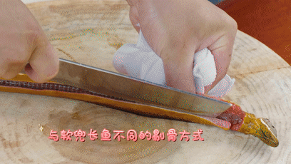 大厨用的是自己精心打磨出的划鳝鱼专用工具:牛骨。我们在家也可以用小刀或者竹扦子。