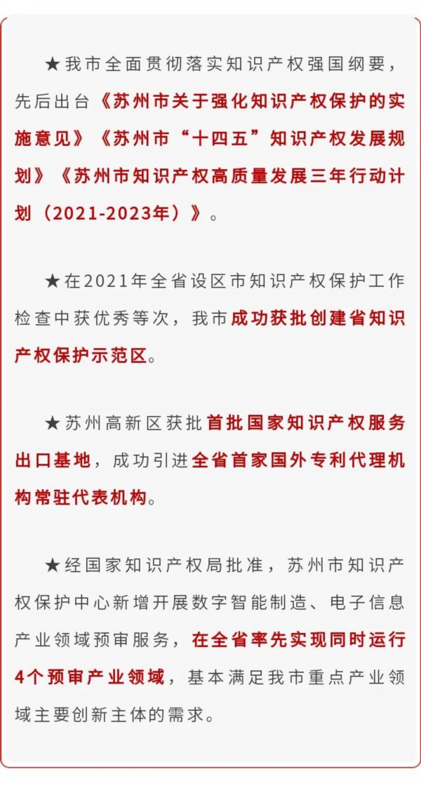 以此次获评国家知识产权强市建设示范城市为契机,苏州将按照“率先高标准建成国家知识产权强市,打造知识产权要素集聚新高地”总体目标,力争通过3年努力,推进示范城市建设取得明显成效,知识产权要素更加集聚,知识产权保护更加严格,知识产权运用更加高效,知识产权服务更加优化,知识产权人才更加充沛,推动各项工作争先进、创一流,努力打造全国领先的知识产权工作品牌。