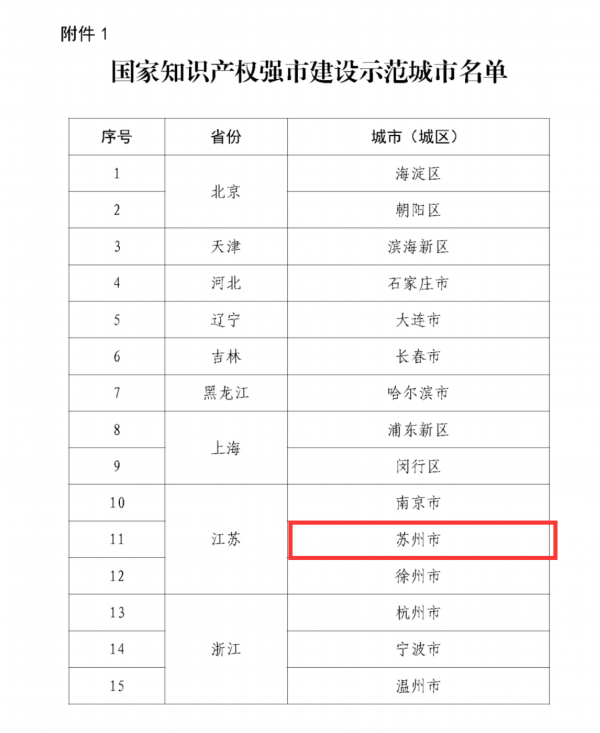 38个城市(城区)被确定为国家知识产权强市建设示范城市,其中,苏州榜上有名,首批入选示范城市名单,是江苏省3个入选城市之一。