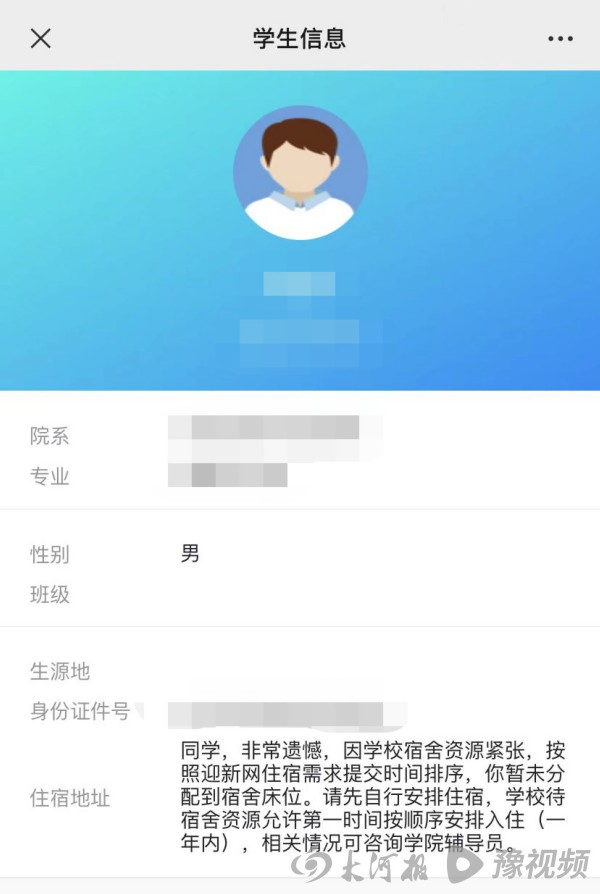 原因是近几日他被学校告知,因学校宿舍资源紧张,他没有被分配到宿舍床位,入学后需要在校外租房,且没有任何形式的补贴。