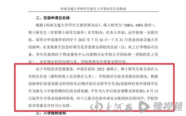 据大河报·豫视频记者所知,西南交大至少二百名全日制硕博新生在开学时面临着无宿舍可住的烦恼。