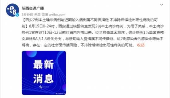 8月15日0-24时,西安通过核酸筛查发现2例本土确诊病例,为母子关系,本土确诊病例1曾在8月10日-12日前往省内外市出差。经全病毒基因测序,确诊病例1为奥密克戎变异株BA.5.1.3进化分支,与近期输入疫情属不同传播链。这2例感染者的感染来源尚不明确,存在一定的社会面传播风险,不排除后续检出阳性病例的可能。