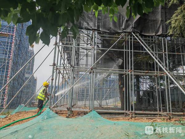 负责人表示,目前园林绿化部门已经实施针对性保护措施。落实“一树一策”管理要求,根据每一株古树的立地条件、生长态势等实际情况,切实做到“因地制宜”,分别采取定期灌溉补水、及时防腐处理、搭建防晒网罩、补充营养液等措施。同时,要求责任单位落实古树名木保护具体举措。“我们设立了保护的区域用围挡围起来,这块区域不允许随便进入,里面定期进行除草,大型机械是不允许进入古树保护范围的,有突发情况,比如极端高温,我们会进行持续关注。”施工现场负责人陈启坤说。
