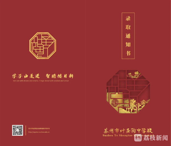 苏州市叶圣陶中学校的通知书外部以深红色和金黄色为主体色调,庄重而优雅,独特的“叶圣陶”字样的镂空窗花宛如一扇散发着金光的明窗,照亮圣陶学子们“自求得之”的知识探索之路。