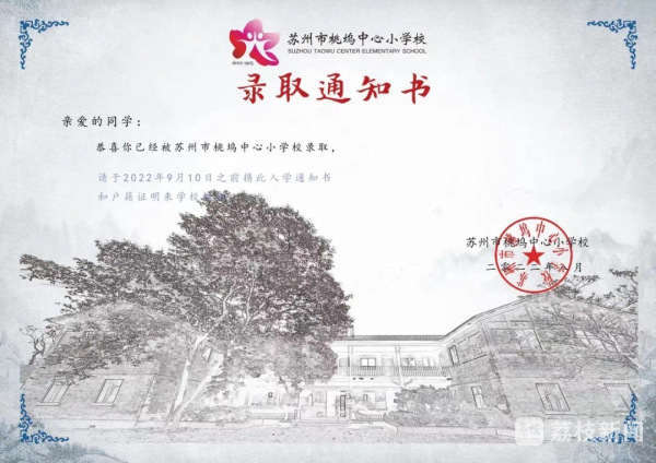 夏日里比阳光更热烈的便是孩子们对录取通知书的期待,而一张张录取通知书也饱含着对“小桃娃们”的殷殷期许。苏州市桃坞中心小学校作为一所百年老校,校园里建于1934年的绿楼见证了学校的百年变迁。该校的通知书以此为封底,并缀以校标。方寸之间,朴素庄重,独具匠心。