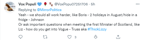 不过,也有网友讽刺英国政府没有做好表率作用:“是的——我们都应该更努力工作,就像约翰逊(英国首相)8月份休了2个假期、躲在冰箱里那样,或者像特拉斯会见苏格兰政府首席大臣问一些重要问题,比如如何登上时尚杂志《Vogue》。”↓