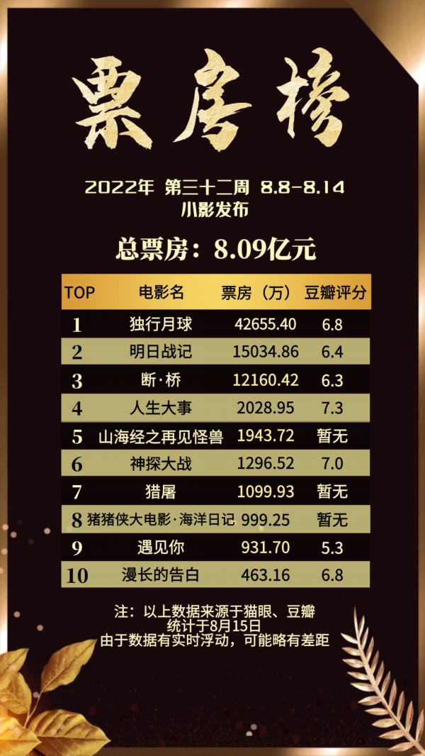 2022年第32周内地电影总票房8.09亿,环比下降42.3%。据统计,截至8月13日16时38分,今年暑期档票房达73.82亿元,提前那超过去年73.81亿元的成绩,目前累计票房已超75亿,尽管离2019年夏天还有一段距离,考虑到今年北京、上海两大票仓在暑期档初期的缺失,取得这样的成绩属实不易,再次振奋行业信心。