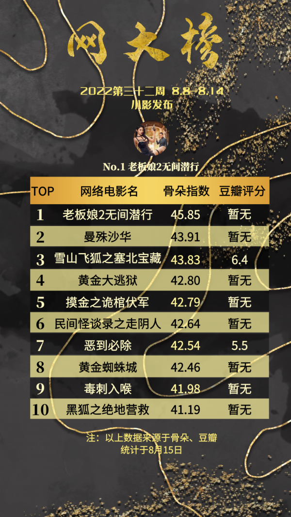 本周网络电影榜单榜首由《老板娘2无间潜行》获得,该片由谢天华、徐冬冬领衔主演,在明星阵容上较为强大。本周上线的新片还有由南笙、李嘉铭领衔主演的神话爱情电影《曼殊沙华》,位居榜二。《雪山飞狐之塞北宝藏》《黄金大逃狱》《 恶到病除》均是上周的在榜作品,上线已80天的《摸金之诡棺伏军》于本周冲进榜单。