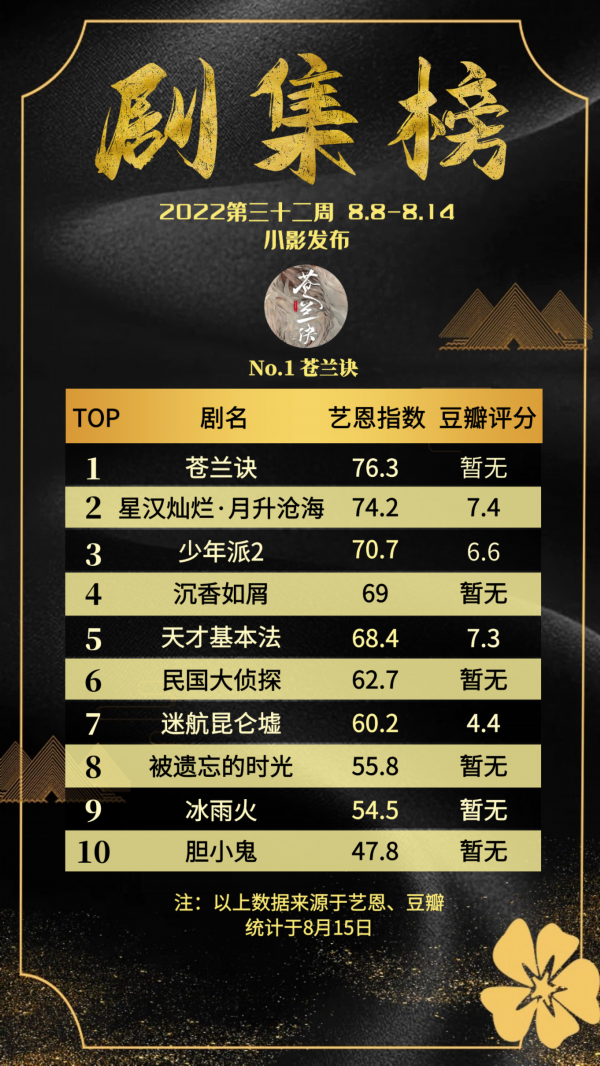 本周25部首轮剧在播,头部剧表现强势。新剧《苍兰诀》以反套路的东方幻想题材、优秀的特效和有趣的故事情节,快速吸引到年轻人追捧,位居榜首;《星汉灿烂》《少年派2》《沉香如屑》等稳居头部。