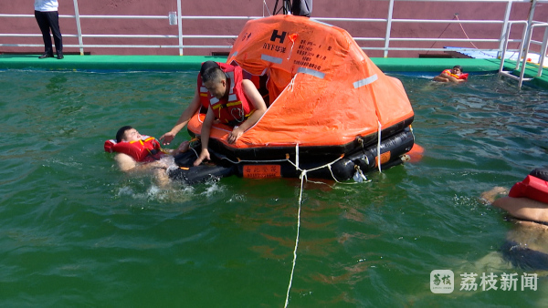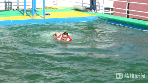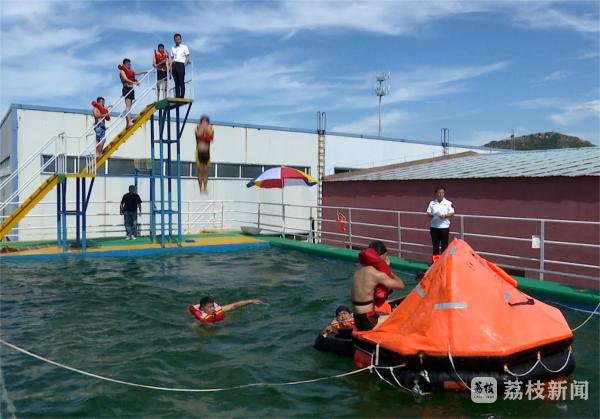 其中海上个人求生考核时,学员需要从五米高的跳台中,身穿救生衣按照标准姿势进行跳水作业,随后再进行登离救生筏作业。据参加考核的学员介绍,他们在一开始练习跳水时,因“怕高”、“怕水”而不敢跳,经过一段时间的锻炼后,基本都能克服这样的“恐惧”心理,很好地掌握跳水这项技能本领。