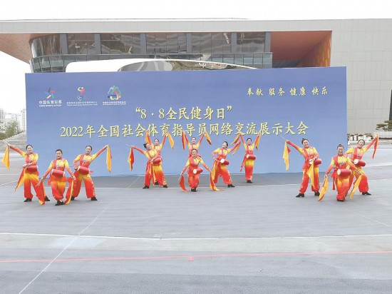 盐城市健身腰鼓队代表江苏参加2022年全国社会体育指导员网络交流展示大会。