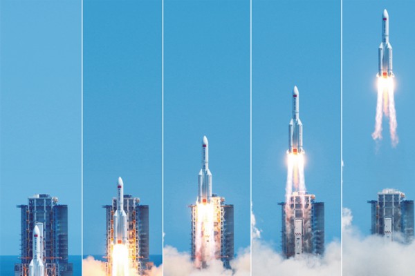 问天实验舱是中国空间站第二个舱段,也是首个科学实验舱。2022年7月24日,搭载问天实验舱的长征五号B遥三运载火箭,在我国文昌航天发射场准时点火发射。 新华社记者 李刚/摄