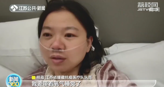 江苏省援藏抗疫医疗队队员明霞表示:“跟了整整一天的活,晚上有点喘,今晚我要带着氧气睡觉了,为了明天更好地为西藏人民服务。”