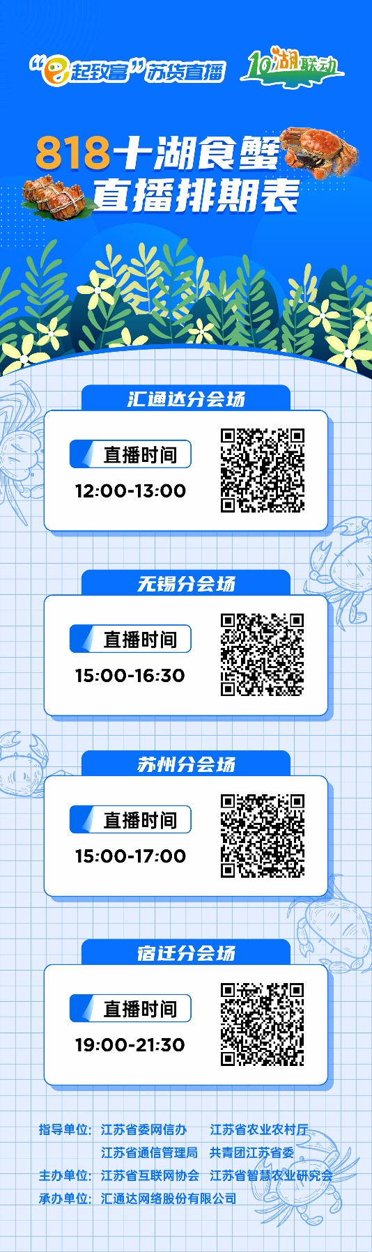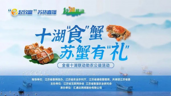 在省委网信办、省农业农村厅、省通信管理局、共青团江苏省委联合指导下,依托于“e起致富 苏货直播”助农公益品牌行动,由江苏省互联网协会、江苏省智慧农业研究院主办、汇通达网络股份有限公司承办的【e起致富 苏货直播】2022年度江苏省“十湖食蟹·苏蟹有礼”十湖联动·助农公益活动于8月18日(今日)线上全面启动!