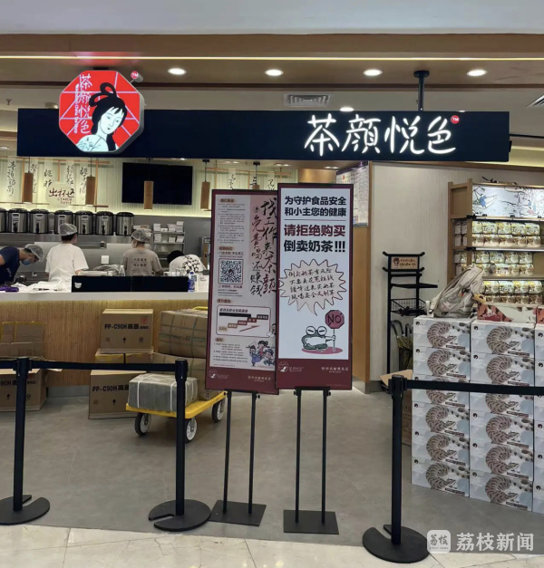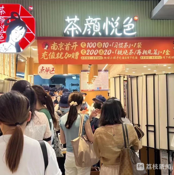 在南京市江宁景枫商场内,虽然这家奶茶店早上9点才正式开业,但是迫不及待的人群已经排到了地铁口;而开业仅仅半小时后,店铺就因为人流量过大,挂出了暂停营业的告示。