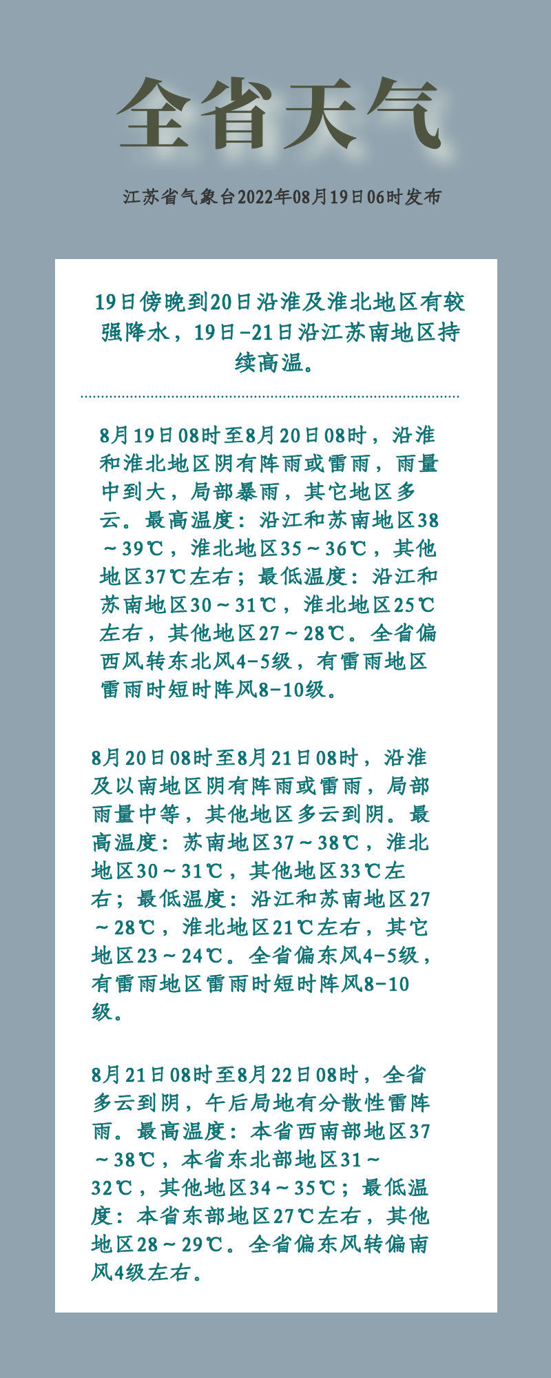 8月19日08时至8月20日08时,沿淮和淮北地区阴有阵雨或雷雨,雨量中到大,局部暴雨,其它地区多云。最高温度:沿江和苏南地区38~39℃,淮北地区35~36℃,其他地区37℃左右;最低温度:沿江和苏南地区30~31℃,淮北地区25℃左右,其他地区27~28℃。全省偏西风转东北风4-5级,有雷雨地区雷雨时短时阵风8-10级。