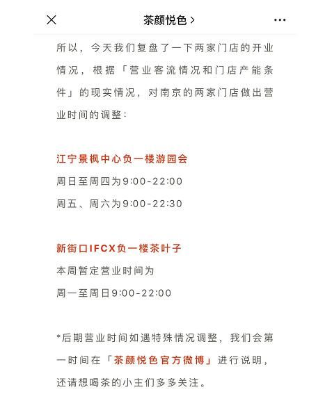 *后期营业时间如遇特殊情况调整,我们会第一时间在「茶颜悦色官方微博」进行说明,还请想喝茶的小主们多多关注。