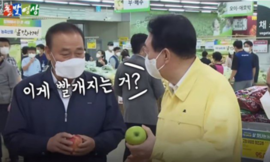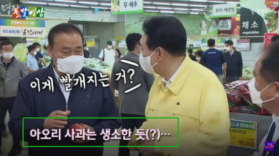 韩国总统尹锡悦为稳定民生而视察首尔某家超市时,手拿一个“青苹果”问道,“这是什么”,“会变红吗”?韩国网友将相关视频中的这一场面进行截图,以“总统不懂民生”为由,在韩网引发争议。 图自韩媒