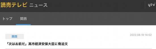 【环球网报道】据日本读卖电视台19日报道,日本经济安全保障担当大臣高市早苗的事务所18日下午收到威胁信,上面写着“下一个就是你”,“洗干净脖子等着吧”等内容。