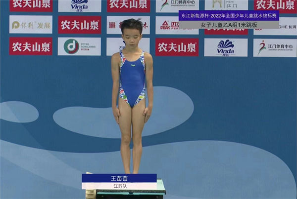 8月16日,2022年全国少年儿童跳水锦标赛在广东省江门市体育中心游泳馆正式拉开战幕。8月18日,在女子儿童乙A组1米跳板的争夺战中,代表江苏队出战的王苗苗以总分195.25分,超出第二名选手20.65分的绝对优势,夺得该项目的冠军。同时,王苗苗还获得这个组别个人全能的冠军。