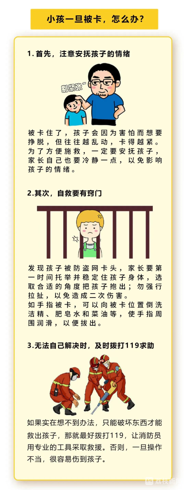 消防提醒:儿童年龄小,安全意识还不高。家长要加强对孩子的安全教育和监管,尽量不让孩子远离自己的视线,以免遭受意外伤害。若遇类似情况,家长们不要惊慌,应先安慰孩子情绪不要挣扎,以免造成二次受伤,并及时拨打119报警电话求救。