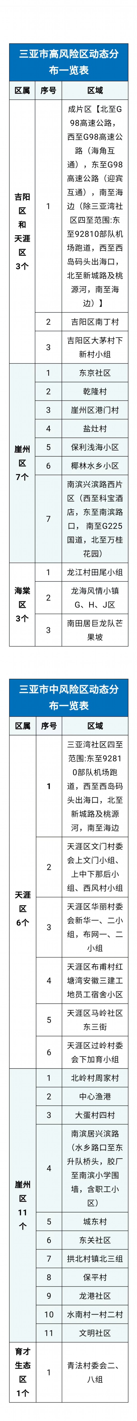 根据当前三亚市疫情防控工作需要,按照国务院应对新型冠状病毒肺炎疫情联防联控机制综合组《新型冠状病毒肺炎防控方案(第九版)》相关规定,经专家组研判,三亚市疫情防控指挥部决定,高风险区域调整为13个、中风险区域调整为18个。