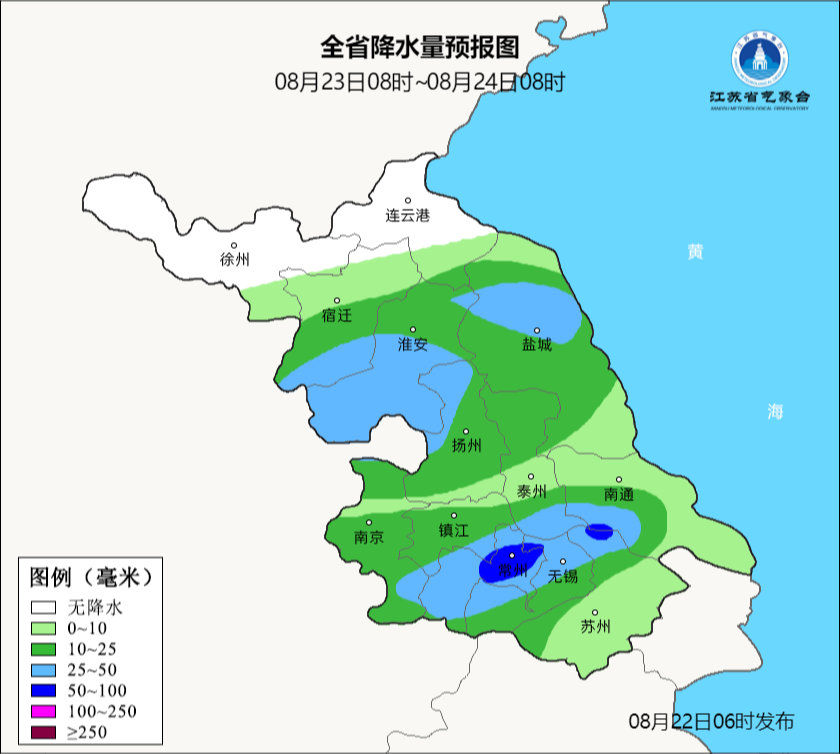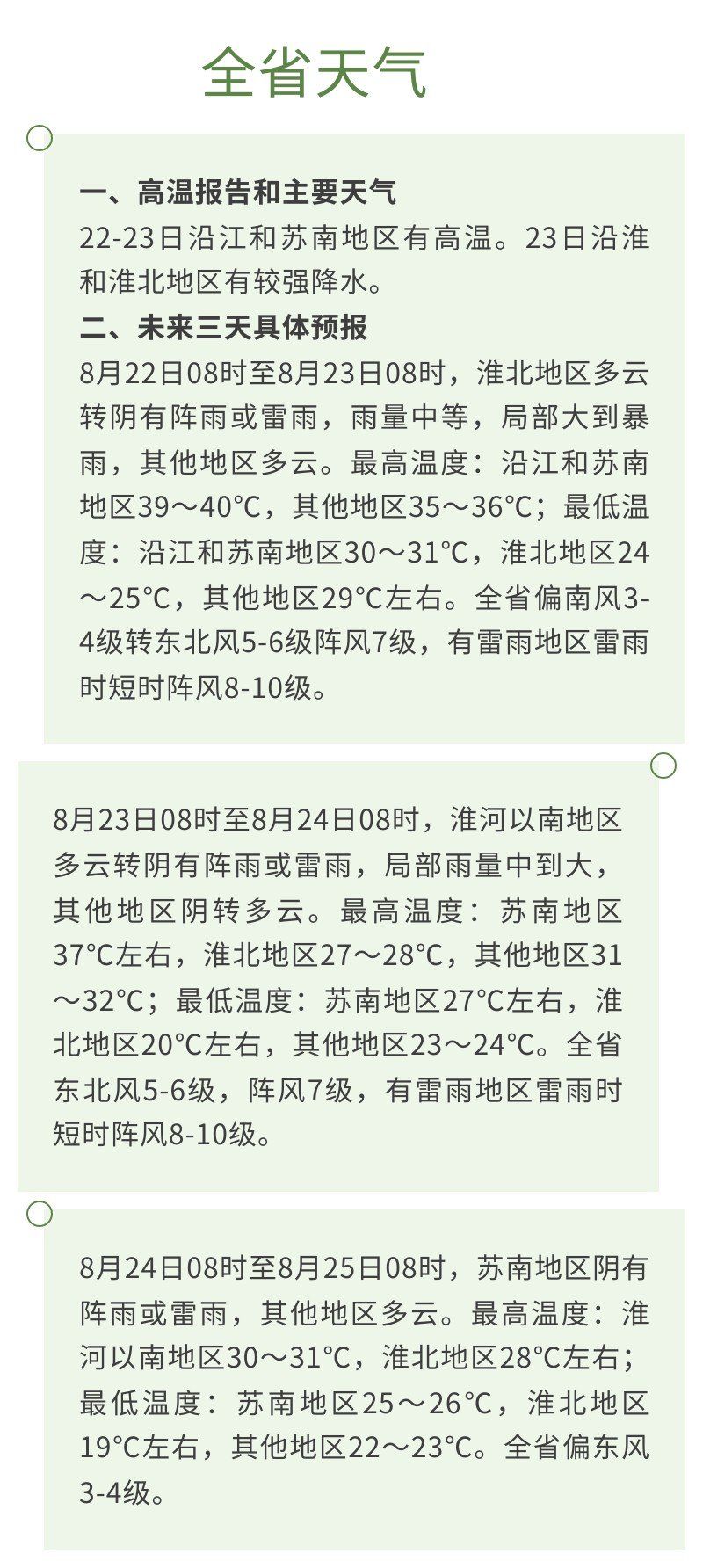 据江苏省气象台,22-23日沿江和苏南地区有高温。23日沿淮和淮北地区有较强降水。
