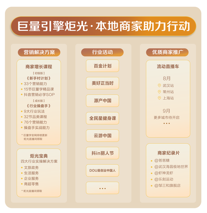 自8月15日起,在全国工商联宣教部的指导下,巨量引擎联合新华网推出《炬光》之本地商家助力行动,以巨量引擎本地消费业务中心「美好正当时」项目在全国开启一场有温度的“本地商家助力行动”,一辆炬光直播车,跨越近五千公里,深入本地,持续助力本地商户生意复苏,看见城市美好生活。