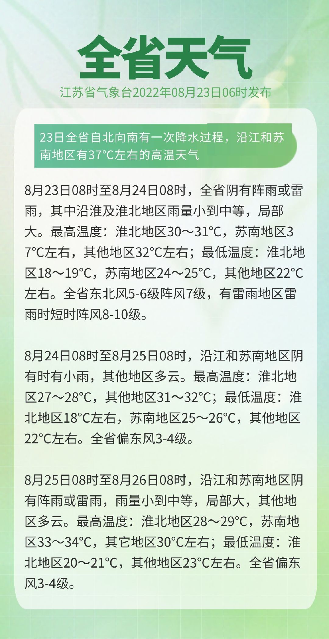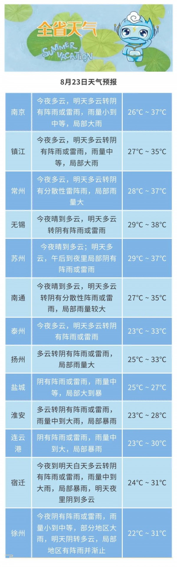 8月23日08时至8月24日08时,全省阴有阵雨或雷雨,其中沿淮及淮北地区雨量小到中等,局部大。最高温度:淮北地区30~31℃,苏南地区37℃左右,其他地区32℃左右;最低温度:淮北地区18~19℃,苏南地区24~25℃,其他地区22℃左右。全省东北风5-6级阵风7级,有雷雨地区雷雨时短时阵风8-10级。
