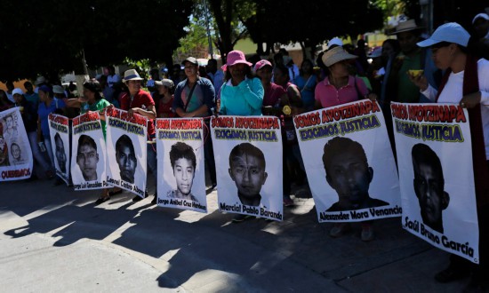 2014年11月27日,在墨西哥格雷罗州,伊瓜拉市失踪学生的亲属手持他们的照片参加抗议活动,要求政府寻找失踪学生下落。新华社/路透