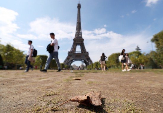 这是8月17日在法国巴黎战神广场拍摄的干枯的草坪和干枯脱落的树叶。新华社记者高静摄