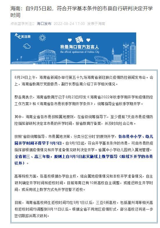 荔枝新闻讯 据“海口发布”微信号消息,按照海南“省级统筹指导、市县属地决策、分类分区分时”的原则开学,各市县中小学、幼儿园开学时间不得早于9月5日 。自9月5日起,符合开学基本条件的市县,可由市县防疫指挥部根据疫情情况和开学准备情况研判决定开学。省属中小学幼儿园纳入属地管理。全省初三、高三年级,原则上自9月5日起实施线上教学指导(除线下开学的市县以外) 。