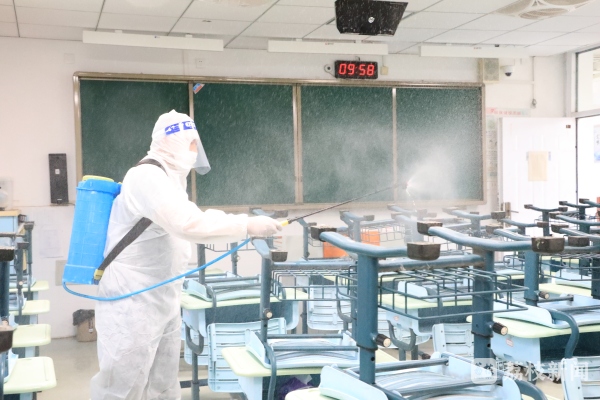 防疫消毒现场,工作人员身着专业的防护装备,手持喷雾器,对全校内校外公共场所逐一实施消毒防疫,重点对教室、楼道、厕所等关键区域实施消毒,与校方同心协力,齐抓共管,为广大学生创造安宁、和谐的学习环境。 短短几分钟,工作人员额头上汗珠不停往下流 。