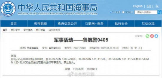 据中国海事局网站消息,青岛海事局发布航行警告,8月25日8时至18时,黄海部分海域进行军事活动,禁止驶入。