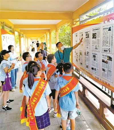 8月的一天上午,孩子们银铃般的笑声和此起彼伏的提问声回荡在樱洲长廊——来自南京小营小学雏鹰假日小队四(6)中队的小学生,正在一边认真听义务讲解的老兵讲述《双拥周刊》版面上那些或远或近、或精彩或有趣的故事,一边不停地提问。