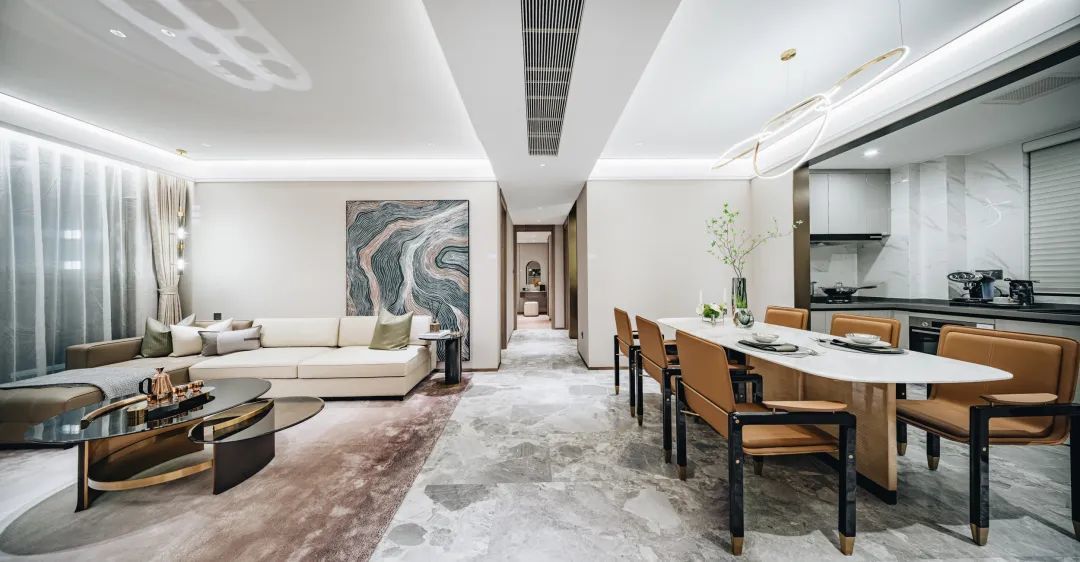 客厅与餐厅融合成一个整体,是温润有度的沉浸式交互空间。太太边烹饪美食边和客厅的家人对话,温馨一刻,酝酿的是恰到好处的温柔,一家三口融入静谧空间的暖心画面,构建一个柔和不忍打扰的氛围。