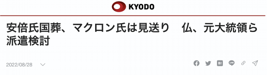 日本共同社28日报道,多名法国政府相关人士透露,法国总统马克龙计划放弃出席日本前首相安倍晋三的“国葬”。