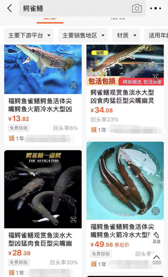 27日,中新财经查阅电商平台发现,部分平台已无法搜索到鳄雀鳝,但在一些电商平台上,仍有商家在出售鳄雀鳝,从商家报价看,一条鳄雀鳝只需几十元便可买到,贵的也不过几百元。