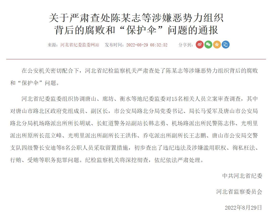 河北省纪委监委组织协调唐山、廊坊、衡水等地纪委监委对15名相关人员立案审查调查,其中对唐山市路北区政府党组成员、副区长,市公安局路北分局党委书记、局长马爱军及唐山市公安局路北分局机场路派出所所长胡斌、长虹道警务站副站长韩志勇、机场路派出所民警陈志伟、光明里派出所原所长范立峰、光明里派出所副所长王洪伟、乔屯派出所副所长王志鹏、唐山市公安局交警支队四级警长安迪等8名公职人员采取留置措施,初步查出了违纪违法及涉嫌滥用职权、徇私枉法、行贿、受贿等职务犯罪问题。纪检监察机关将深挖彻查,依纪依法严肃处理。