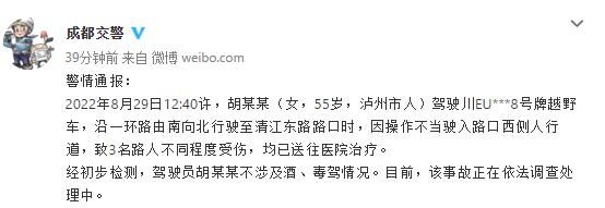 2022年8月29日12:40许,胡某某(女,55岁,泸州市人)驾驶川EU***8号牌越野车,沿一环路由南向北行驶至清江东路路口时,因操作不当驶入路口西侧人行道,致3名路人不同程度受伤,均已送往医院治疗。