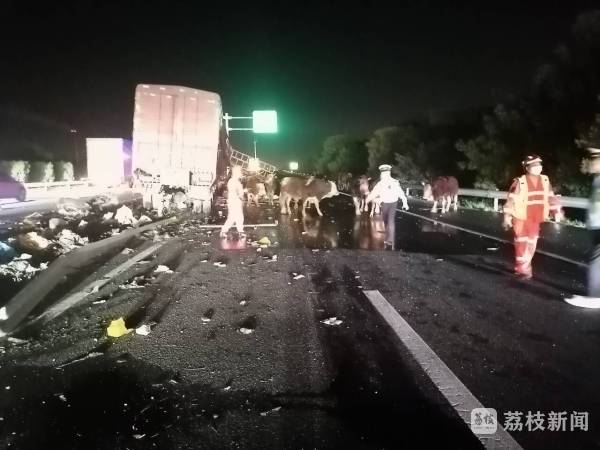 2022年8月29日凌晨1点半,沪蓉高速发生一起交通事故,宁沪第二大队接监控中心通知立即派人员到场勘查情况。发现事故车辆为运牛车,碰撞丹阳大桥护栏后导致车厢破损,牛群脱离车厢在路面上肆意乱窜,事态严重。