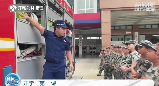 在兴化中学,消防救援大队组织人员给高一新生带来了军训第一课。宣讲员从校园火灾特点入手,通过多媒体课件,结合典型校园火灾案例,讲解常用灭火器材、室内消防设施、逃生疏散器材等使用方法及注意事项,并开展实战演练。
