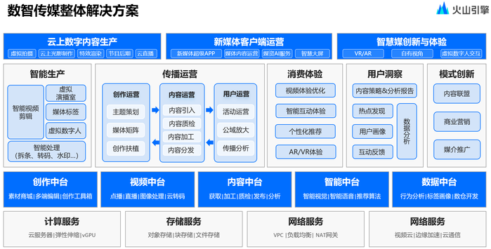 火山引擎是字节跳动旗下的云服务平台,致力于将字节跳动快速发展过程中积累的增长方法、技术能力和工具开放给外部企业,提供云基础、视频与内容分发、大数据、人工智能、开发与运维等服务,帮助企业在数字化升级中实现持续增长。火山引擎面向媒体客户构建全局化、互动化、智能化的媒体运营场景,借助智能内容处理、用户画像、推荐算法、增长分析等技术,满足内容生产、消费、传播、运营等综合需求。