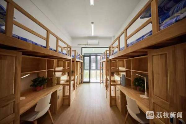 宿舍4人一间,独立空调,干湿分离,配置健康照明和台灯,每位学生均有独立学习桌椅,储物空间考虑周到,入床休息的阶梯安全,满足学生学习和生活的需要。