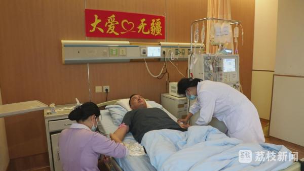 上午8:20,方斐在南京明基医院血液科的血液采集室接受造血干细胞采集。妻子殷年花在旁边陪伴他,给他喂水陪他聊天,缓解紧张心情。